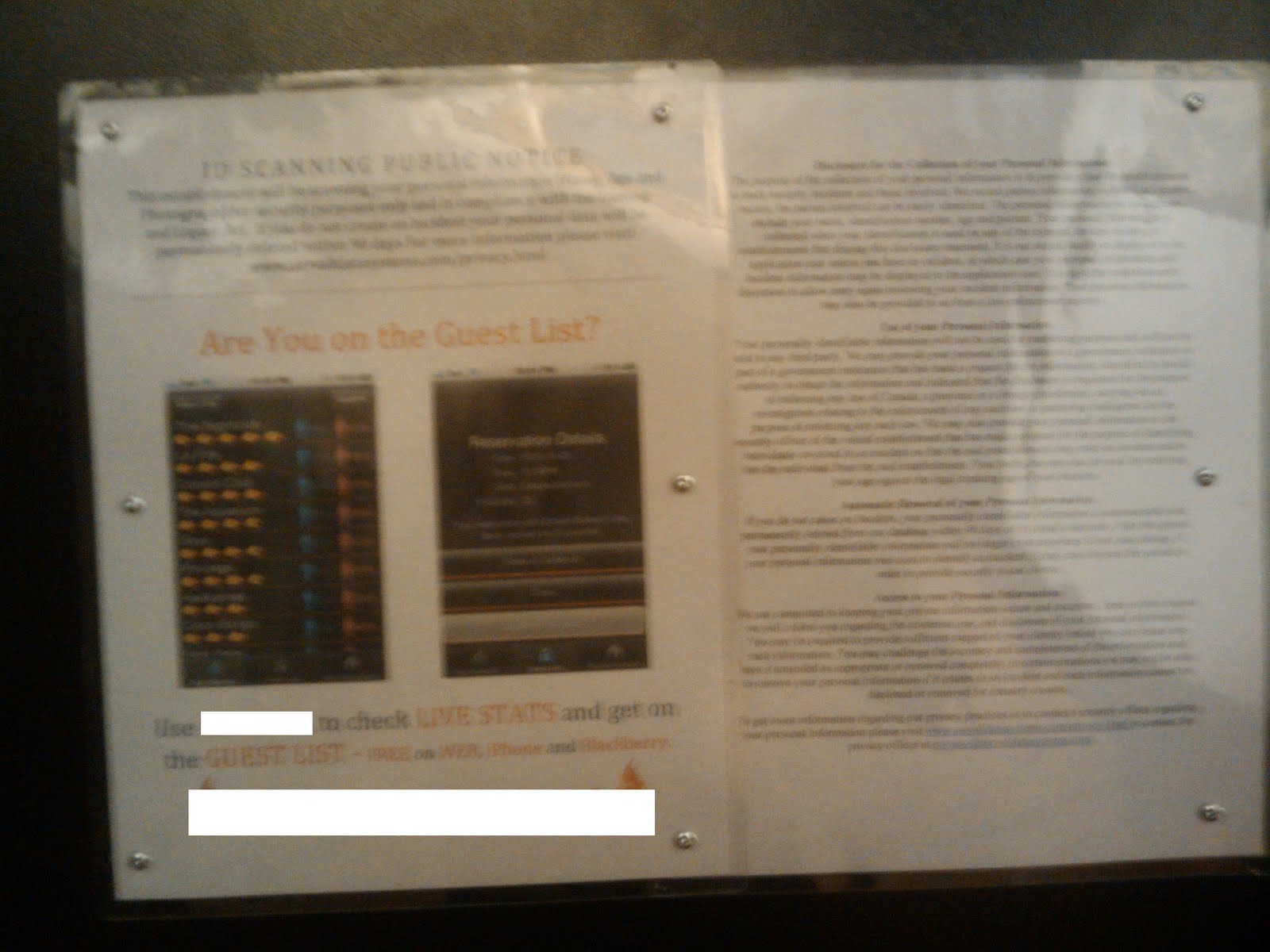 First off, the bouncer said, “Why does everybody do that?” (Take a picture of the notice.) He told me a little bit about how it works. He didn’t think it was too bad as-is, but then told me that they would be appearing in more and more clubs, and that if you created an “incident” in one, the others could ban you. This he found “a little Big Brother-ish”.