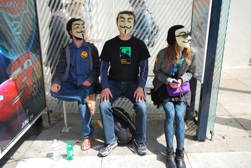 Now for some levity: we had four people at Bay to Breakers with Anonymous-style V-for-Vendetta masks and Bradley Manning stickers. We got a couple pictures of “Anonymous waiting for the bus”. We had a great shot planned on a billboard, but there was a cop attending to a passed-out woman right by the fence we would have had to scale. Discretion being the better part of valor, we let it go.