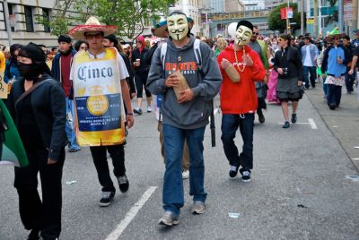 We also handed out some V-for-Vendetta masks to others. As you can see, a couple of guys in hoodies took them and look more suited to them than we did!