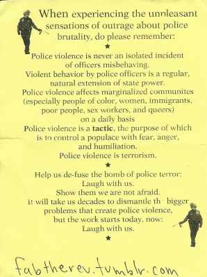 This very hateful and violent impulse is a scary thing to face in myself. But I see no value in denying it. It’s there, the mirror image of the sickness that the cops carry, that they give into. It has been one thing for me to read Martin Luther King Jr.’s words about how violence leads only to violence, and how hatred only leads to more hatred. It was one thing to become angry at the police and realize that that is a deliberate effect of state violence.